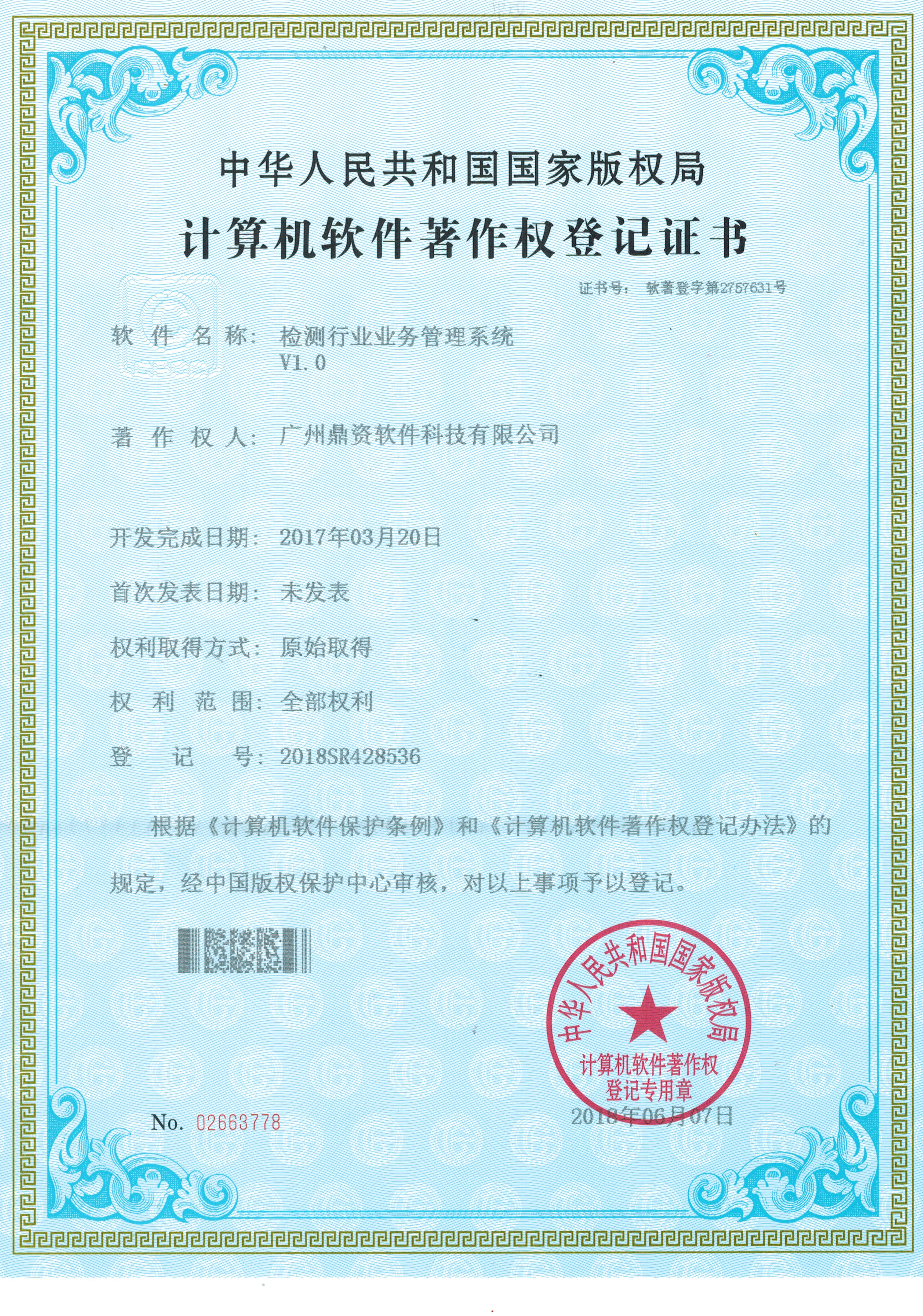 计算机软件著作权登记证书_检测行业业务管理系统